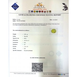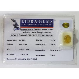 REPORT NO . LY 289CLARITY . N/ACOLOUR . YELLOWSHAPE / CUT . OVALWT . 3.29 CTSDIMENSION . 9-5.7-1.5-1.R . INDEX . 1.76-1.78HARDNESS . 9.0COMMENT . YELLOW SAPPHIRE..
