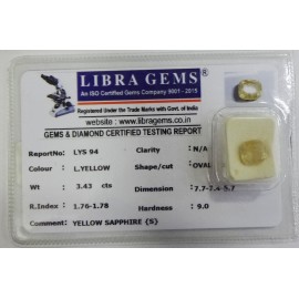 REPORT.NO.-LYS 94CLARITY.-N/ACOLOUR.-L. YELLOWSHAPE/CUT.-OVALWT.-3.43 CTSDIMENSION.-7-7.7-4.5-7.R.INDEX.-1.76-1.78HARDNESS.-9.0COMMENT.-YELLOW SAPPHIRE { S }..