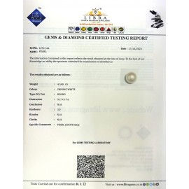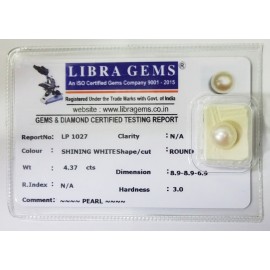 REPORT NO . LP 1027CLARITY . N/ACOLOUR . SHINING WHITESHAPE / CUT . ROUNDWT . 4.37 CTSDIMENSION . 8-9.8-9.6-9.R . INDEX . N/AHARDNESS . 3.0COMMENT . PEARL..