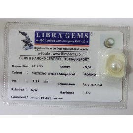 REPORT NO . LP 155CLARITY . N/ACOLOUR . SHINING WHITESHAPE / CUT . ROUNDWT . 4.17CTSDIMENSION . 8-7.9-2.6-4.R . INDEX . N/AHARDNESS . 3.0COMMENT . PEARL..