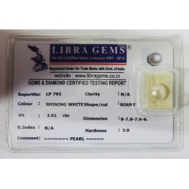 REPORT NO . LP 795CLARITY . N/ACOLOUR . SHINING WHITESHAPE / CUT . ROUNDWT . 3.91 CTSDIMENSION . 8-7.8-7.6-8.R . INDEX . N/AHARDNESS . 3.0COMMENT . PEARL..