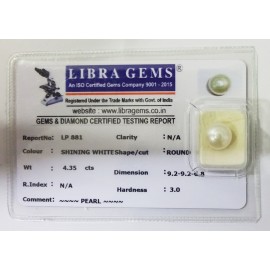 REPORT.NO-LP 881CLARITY-N/ACOLOUR-SHINING WHITESHAPE/CUT-ROUNDWT-4.35 CTSDIMENSION-9.2-9.2-6.8R.INDEX-N/AHARDNESS-3.0COMMENT-PEARL..