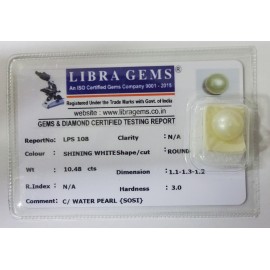 REPORT NO . LPS 108CLARITY . N/ACOLOUR . SHINING WHITESHAPE / CUT . ROUNDWT . 10.48 CTSDIMENSION . 1-1.1-3.1-2.R . INDEX . N/AHARDNESS . 3.0COMMENT . C / WATER PEARL { SOSI }..
