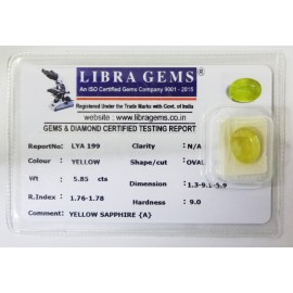 REPORT.NO.-LYA 199CLARITY.-N/ACOLOUR.-YELLOWSHAPE/CUT.-OVALWT.-5.85 CTSDIMENSION.-1-3.9-1.5-9.R.INDEX.-1.76-1.78HARDNESS.-9.0COMMENT.-YELLOW SAPPHIRE { A }..