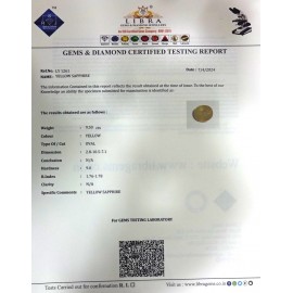 REPORT.NO.LYS 133CLARITY.N/ACOLOUR.L.YELLOW SHAPE/CUT.OVAL WT.3.93 CTS DIMENSION.1.1-6.6-4.9 R.INDEX.1.76-1.78HARDNESS.9.0COMMENT. YELLOW SAPPHIRE {S}..