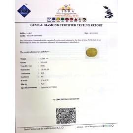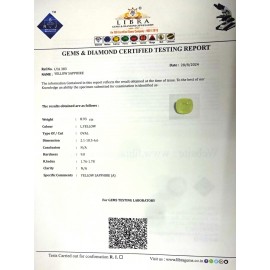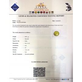 REPORT.NO.-LY 679CLARITY.-N/ACOLOUR.-YELLOWSHAPE/CUT.-OVALWT.-4.93 CTSDIMENSION.-1-9.9-2.4-3.R.INDEX.-1.76-1.78HARDNESS.-9.0COMMENT.-YELLOW SAPPHIRE..