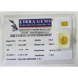 REPORT.NO.LYA 100CLARITY.N/ACOLOUR.SHAPE/CUT.RECTANGLEWT.3.74 CTSDIMENSION.8.2-8.8-4.9R.INDEX.1.76-1.78HARDNESS.9.0COMMENT.YELLOW SAPPHIRE {A}..