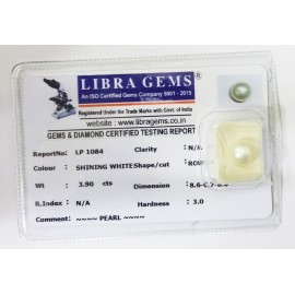 REPORT NO . LP 1084CLARITY . N/ACOLOUR . SHINING WHITESHAPE / CUT . ROUNDWT . 3.70 CTSDIMENSION . 8-6.6-7.8-6.R . INDEX . N/AHARDNESS . 3.0COMMENT . PEARL..