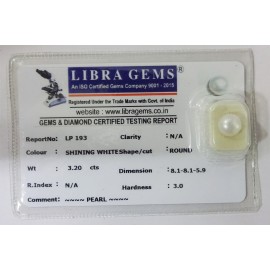 REPORT NO . LP 193CLARITY . N/ACOLOUR . SHINING WHITESHAPE / CUT . ROUNDWT . 3.20 CTSDIMENSION . 8-1.8-1.5-9.R . INDEX . N/AHARDNESS . 3.0COMMENT . PEARL..
