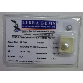 REPORT NO . LP 563CLARITY . N/ACOLOUR . SHINING WHITESHAPE / CUT . ROUNDWT . 6.27 CTSDIMENSION . 9-9.9-9.7-7.R . INDEX . N/AHARDNESS . 3.0COMMENT . PEARL..