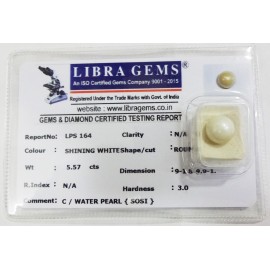 REPORT NO . LPS 164CLARITY . N/ACOLOUR . SHINING WHITESHAPE / CUT . ROUNDWT . 5.57 CTSDIMENSION . 9-1.8-9.9-1.R . INDEX . N/AHARDNESS . 3.0COMMENT . C / WATER PEARL { SOSI }..