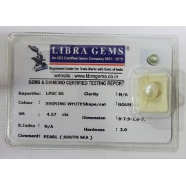REPORT NO . LPSC 85CLARITY . N/ACOLOUR . SHINING WHITESHAPE / CUT . ROUNDWT . 4.57 CTSDIMENSION . 8-7.9-1.8-7.R . INDEX . N/AHARDNESS . 3.0COMMENT . PEARL { SOUTH SEA }..