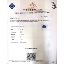 DATE:24-5-2024REF.NO:LN 1120NAME:BLUE SAPPHIREWEIGHT:6.26 CTSCOLOUR:BLUETYPE OF/CUT:OVALDIMENSION:10.8-8.6-7.1CONCLUSION:N/AHARDNESS:9.0R.INDEX:1.76-1.78CLARITY:N/ASPECIFIC COMMENTS:BLUE SAP..