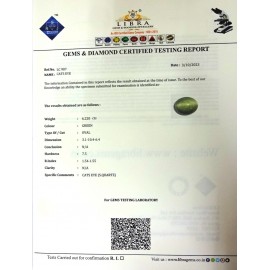 REPORT NO . LC 27CLARITY . N/ACOLOUR . L . GREENSHAPE / CUT . OVALWT . 5.89 CTSDIMENSION . 2-3.10-4.6-6.R . INDEX . 1.54-1.55HARDNESS . 7.5COMMENT . CATS EYE { S . QUARTZ }..