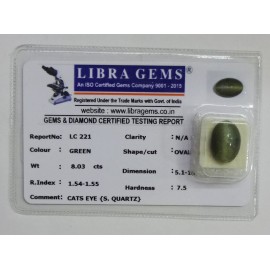 REPORT NO . LC 221CLARITY . N/ACOLOUR . GREENSHAPE / CUT . OVALWT . 8.03 CTSDIMENSION . 5-1.10-5.7-1.R . INDEX . 1.54-1.55HARDNESS . 7.5COMMENT . CATS EYE { S . QUARTZ }..