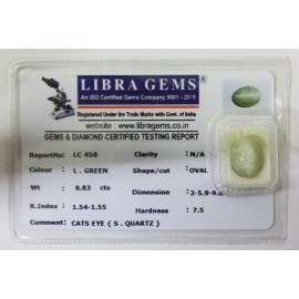 REPORT.NO.LC 458CLARITY.N/ACOLOUR.L.GREENSHAPE/CUT.OVALWT.8.83 CTS DIMENSION.2.5-9.9-8.1R.INDEX.1.54-1.55HARDNESS.7.5COMMENT.CATS EYE {S.QUARTZ}..