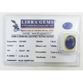 REPORT.NO.LN 645CLARITY.N/ACOLOUR.BLUESHAPE/CUT.OVAL WT.10.67 CTSDIMENSION.5.8-1.4-6.1R.INDEX.1.76-1.7.8HARDNESS.9.0COMMENT.BLUE SAPPHIRE..