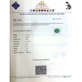 REPORT NO . LEJ 4CLARITY . N/ACOLOUR . GREENSHAPE / CUT . OVALWT . 4.09 CTSDIMENSION . 1-5.8-7.5-8.R . INDEX . 1.57HARDNESS . 7.5COMMENT . EMERALD ( J )..
