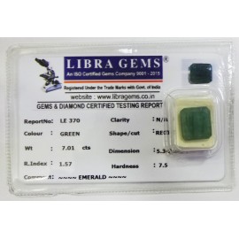 REPORT NO . LEJ 152CLARITY . N/ACOLOUR . GREENSHAPE / CUT . SQUAREWT . 2.80 CTSDIMENSION . 7-8.8-1.5-6.R . INDEX . 1.57HARDNESS . 7.5COMMENT . EMERALD { J }..