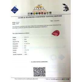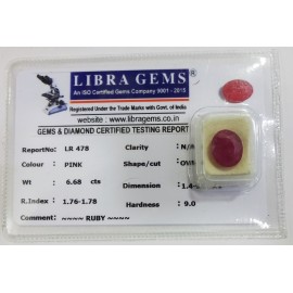 REPORT.NO.-LR 478CLARITY.-N/ACOLOUR.-PINKSHAPE/CUT.-OVALWT.-6.68 CTSDIMENSION.-1-4.9-5.6-1.R.INDEX.-1.76-1.78HARDNESS.-9.0COMMENT.-RUBY..