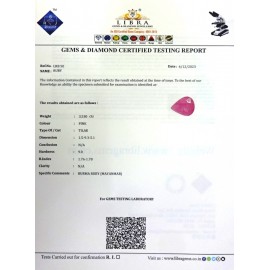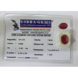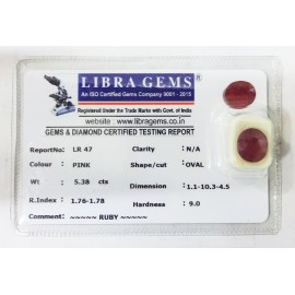 REPORT NO . LR 47CLARITY . N/ACOLOUR . PINKSHAPE / CUT . OVALWT . 5.38 CTSDIMENSION . 1-1.10-3.4-5R . INDEX . 1.76-1.78HARDNESS . 9.0COMMENT . RUBY..