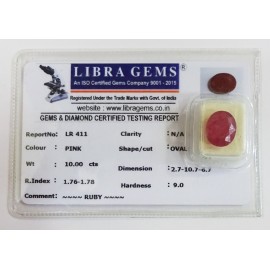 REPORT.NO.-LR 411CLARITY.-N/ACOLOUR.-PINKSHAPE/CUT.-OVALWT.-10.00 CTSDIMENSION.-2-7.10-7.6-7.R.INDEX.-1.76-1.78HARDNESS.-9.0COMMENT.-RUBY..