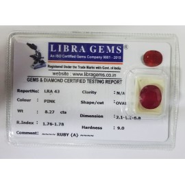 REPORT NO . LRA 43CLARITY . N/ACOLOUR . PINKSHAPE / CUT . OVALWT . 8.27 CTSDIMENSION . 2-1.1-1.6-8.R . INDEX . 1.76-1.78HARDNESS . 9.0COMMENT . RUBY { A }..