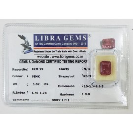 REPORT.NO.LRM 29CLARITY.N/ACOLOUR.PINKSHAPE/CUT.RECTANGLEWT.5.82 CTSDIMENSION.10.1-7.8-6.5R.INDEX.1.76-1.78HARDNESS.9.0COMMENT.RUBY {M}..