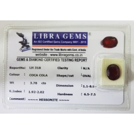 REPORT.NO.-LH 318CLARITY.-N/ACOLOUR.-COCA COLASHAPE/CUT.-OVALWT.-3.78 CTSDIMENSION.-1-1.8-9.4-7.R.INDEX.-1.92-2.02HARDNESS.-6.5-7.5COMMENT.-HESSONITE..
