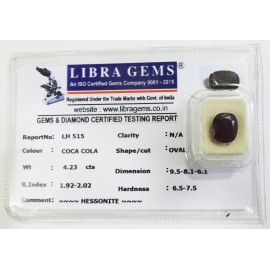 REPORT.NO.-LH 228CLARITY.-N/ACOLOUR.-COCA COLASHAPE/CUT.-OVALWT.-4.78 CTSDIMENSION.-2.6-7.5-5.8R.INDEX.-1.92-2.02HARDNESS.-6.5-7.5COMMENT.-HESSONITE..