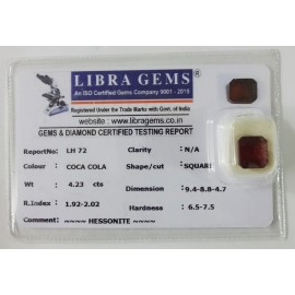 REPORT NO . LH 72CLARITY . N/ACOLOUR . COCA COLASHAPE / CUT . SQUAREWT . 4.23 CTSDIMENSION . 9-4.8-8.4-7.R . INDEX . 1.92-2.02HARDNESS . 6.5-7.5COMMENT . HESSONITE..