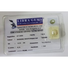 REPORT NO . LP 1050CLARITY . N/ACOLOUR . SHINING WHITESHAPE / CUT . ROUNDWT . 4.15 CTSDIMENSION . 9-1.6-5.9-1.R . INDEX . N/AHARDNESS . 3.0COMMENT . PEARL..