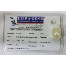 REPORT NO . LP 140CLARITY . N/ACOLOUR . SHINING WHITESHAPE / CUT . ROUNDWT . 3.01 CTSDIMENSION . 8-1.8-3.5-6.R . INDEX . N/AHARDNESS . 3.0COMMENT . PEARL..