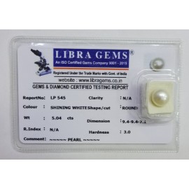 REPORT NO . LP 545CLARITY . N/ACOLOUR . SHINING WHITESHAPE / CUT . ROUNDWT . 5.04 CTSDIMENSION . 9-4.9-4.7-1.R . INDEX . N/AHARDNESS . 3.0COMMENT . PEARL..