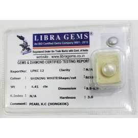 REPORT.NO.-LPKC 12CLARITY.-N/ACOLOUR.-SHINING WHITESHAPE/CUT.-ROUNDWT.-4.41 CTSDIMENSION.-8-9.8-9.7-4.R.INDEX.-N/AHARDNESS.-3.0COMMENT.-PEARL K.C { HONGKOK }..