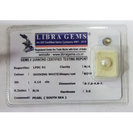 REPORT NO . LPSC 91CLARITY . N/ACOLOUR . SHINING WHITESHAPE / CUT . ROUNDWT . 4.14 CTSDIMENSION . 8-7.8-4.8-7.R . INDEX . N/AHARDNESS . 3.0COMMENT . PEARL { SOUTH SEA }..