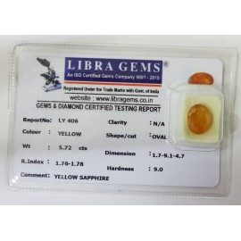 REPORT.NO.LY 406CLARITY.N/ACOLOUR.YELLOWSHAPE/CUT.OVALWT.5.72 CTSDIMENSION.1.7-9.1-4.7R.INDEX.1.76-1.78HARDNESS.9.0COMMENT.YELLOW SAPPHIRE..