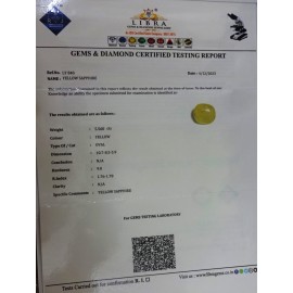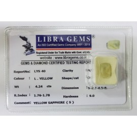 REPORT.NO.LYS 133CLARITY.N/ACOLOUR.L.YELLOW SHAPE/CUT.OVAL WT.3.93 CTS DIMENSION.1.1-6.6-4.9 R.INDEX.1.76-1.78HARDNESS.9.0COMMENT. YELLOW SAPPHIRE {S}..