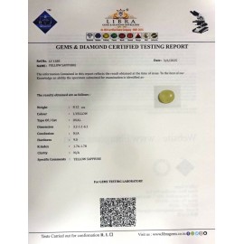 REPORT NO . LYA 11CLARITY . N/ACOLOUR . YELLOWSHAPE / CUT . OVALWT . 4.89 CTSDIMENSION . 2-9.7-9.4-5.R . INDEX . 1.76-1.78HARDNESS . 9.0COMMENT . YELLOW SAPPHIRE..