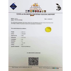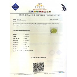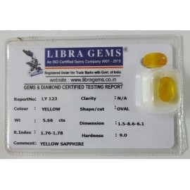 REPORT NO . LY 123CLARITY . N/ACOLOUR . YELLOWSHAPE / CUT . OVALWT . 5.66 CTSDIMENSION . 1-5.8-6.6-1.R . INDEX . 1.76-1.78HARDNESS . 9.0COMMENT . YELLOW SAPPHIRE..
