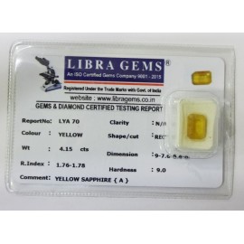 REPORT.NO.LYA 70CLARITY.N/ACOLOUR.YELLOWSHAPE/CUT.RECTANGLEWT.4.15 CTSDIMENSION.9.7-6.6-4.8R.INDEX.1.76-1.78HARDNESS.9.0COMMENT.YELLOW SAPPHIRE {A}..