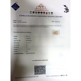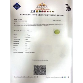 REPORT NO . LY 333CLARITY . N/ACOLOUR . YELLOWSHAPE / CUT . OVALWT . 3.27 CTSDIMENSION . 8-7.7-9.4-5.R . INDEX . 1.76-1.78HARDNESS . 9.0COMMENT . YELLOW SAPPHIRE..