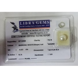 REPORT NO . LP 1068CLARITY . N/ACOLOUR . SHINING WHITESHAPE / CUT . ROUNDWT . 4.03 CTSDIMENSION . 8-9.6-8.8-9.R . INDEX . N/AHARDNESS . 3.0COMMENT . PEARL..