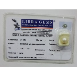 REPORT NO . LP 617CLARITY . N/ACOLOUR . SHINING WHITESHAPE / CUT . ROUNDWT . 3.61 CTSDIMENSION . 8-1.8-1.6-7.R . INDEX . N/AHARDNESS . 3.0COMMENT . PEARL..