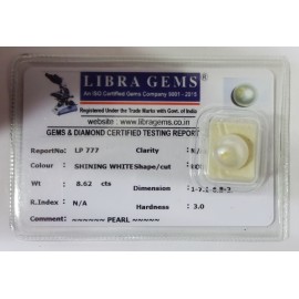 REPORT NO . LP 777CLARITY . N/ACOLOUR . SHINING WHITESHAPE / CUT . ROUNDWT . 8.62 CTSDIMENSION . 1-7.1-6.8-2.R . INDEX . N/AHARDNESS . 3.0COMMENT . PEARL..