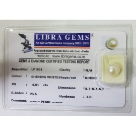 REPORT NO . LP 901CLARITY . N/ACOLOUR . SHINING WHITESHAPE / CUT . ROUNDWT . 4.01 CTSDIMENSION . 8-7.8-7.6-7.R . INDEX . N/AHARDNESS . 3.0COMMENT . PEARL..