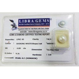 REPORT.NO.-LPKC 129CLARITY.-N/ACOLOUR.-SHINING WHITESHAPE/CUT.-ROUNDWT.-4.89 CTSDIMENSION.-9-2.9-2.7-8.R.INDEX.-N/AHARDNESS.-3.0COMMENT.-PEARL K.C { HONGKOK }..
