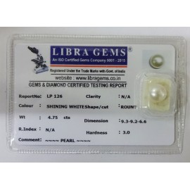 REPORT NO . LP 126CLARITY . N/ACOLOUR . SHINING WHITESHAPE / CUT . ROUNDWT . 4.75 CTSDIMENSION . 9-3.9-2.6-6.R . INDEX . N/AHARDNESS . 3.0COMMENT . PEARL..