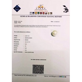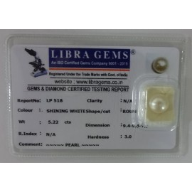 REPORT NO . LP 518CLARITY . N/ACOLOUR . SHINING WHITESHAPE / CUT . ROUNDWT . 5.22 CTSDIMENSION . 9-4.9-4.7-1.R . INDEX . N/AHARDNESS . 3.0COMMENT . PEARL..
