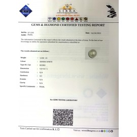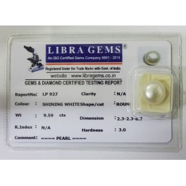 REPORT NO . LP 927CLARITY . N/ACOLOUR . SHINING WHITESHAPE / CUT . ROUNDWT . 9.59 CTSDIMENSION . 2-3.2-3.8-7.R . INDEX . N/AHARDNESS . 3.0COMMENT . PEARL..
